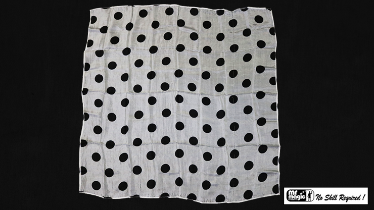 A production silk of all white with black polka dots, measuring 21 inches by 21 inches. When folded, this fine silk takes up very little space.