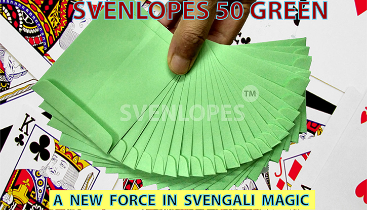 Svengali envelopes in POKER size and green color. This pack of 50 envelopes contains 25 force envelopes and 25 regular envelopes.