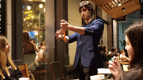 To finish, he wraps the ribbon around the white lighter, snaps his fingers, and reveals it's orange again. Finally, he gives the lighter for examination!