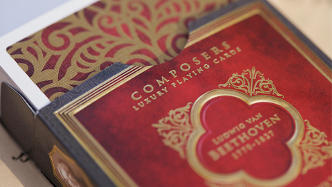 Ludwig Van Beethoven Playing Cards, designed by SixtyFourPlayingCards, is a unique and elegant deck of playing cards for collectors, where the protagonist is one of the greatest Composers of classical and symphonic music of all time -- Ludwig van Beethoven. The theme of Beethoven is dark red, and will be the color of the theme of the tuck box, the back of the cards and the color theme of Court cards.