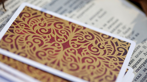The card backs are printed in dark red and metallic golden ink. The tuck case is very luxurious with embossing and foil.