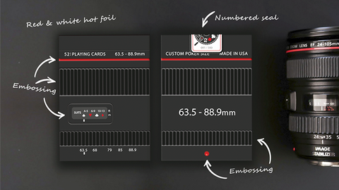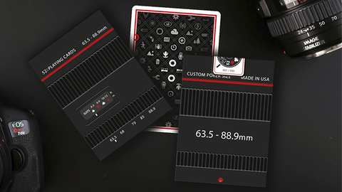 The tuck was designed to mimic the aesthetics of a DSLR camera lens (a.k.a "Glass") while displaying information more related to playing cards. The red ring around the tuck mimics a professional line of lenses, known as Red Rings, which are classified as a higher grade of glass. This deck was created to spark the urge for shooters to get out and shoot.