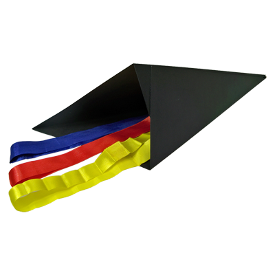 Effect:The Magician shows three ribbon-rings (one red, one blue, and one yellow), and a paper-made cone. He puts the ribbons one by one into the cone, leaving the last one hanging out. After a few magical gestures, he shows that the three ribbon-rings are now mysteriously linked together.