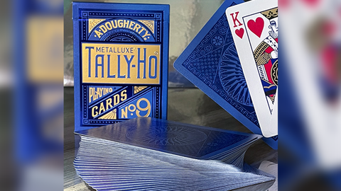 Tally-Ho MetalLuxe® Playing Cards are the ultimate luxury collectable playing card deck. Tally-Ho MetalLuxe Playing Cards feature the classically beautiful Tally-Ho circle card back design in a collector's edition metallic foil. The tuck case and card back are both stamped with real metal foil to achieve a brilliantly dazzling shine. The tuck case features a beautiful, eye-catching royal blue foil as well as a gleaming gold foil, while the card backs are stamped with a stunning blue foil to create the classic Tally-Ho Circle Back design.
