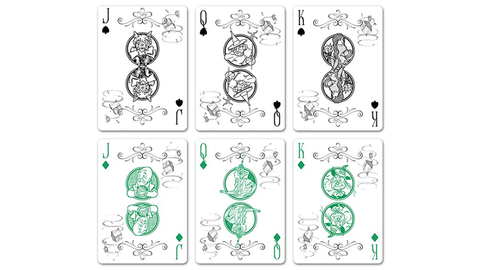 This deck, as with all of the other fig. 23 decks, has two different jokers. It is of the same design and pips as the two previous "storybook" decks. The flip-book animation depicts Dorothy's house being tossed-around within the tornado, transporting Dorothy and Toto to the land of Oz. Of course, being true to "The Wizard of Oz," the diamonds have been replaced with emeralds (same shape, different color - easy-peasy). Keep in mind that this deck is based upon the original book, not the movie - so the slippers on the backside are silver, not ruby!