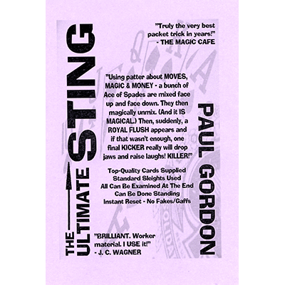 Using patter about MOVES, MAGIC & MONEY - a bunch of Ace of Spades are mixed face up and face down. They then magically unmix. (And it IS MAGICAL) Then, suddenly, a ROYAL FLUSH appears and if that wasn't enough, one final KICKER really will drop jaws and raise laught! KILLER!
