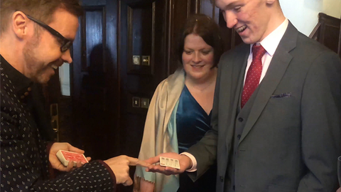 Under test conditions, one card is placed on your spectator's hand. They are asked to name ANY card. You explain that if the freely named card is on the other side of the card in their hand, then they need to get you a drink. They take that bet!