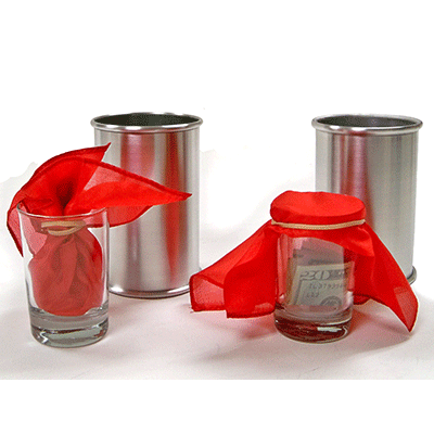 A spectator's bill, which he signs or marks, is placed inside a 9" silk with a rubber band. The silk, rubber band and bill are then placed inside a glass. The glass is covered with an aluminum tube. Before you can blink, the bill has jumped from one tube to the other. But even more amazing, the opening of the second glass is now covered with the 9" silk which is held on by the rubber band and the bill is inside the glass under the silk. And, yes, the spectator removes the band and the silk to discover that it is, indeed, his SIGNED Bill.